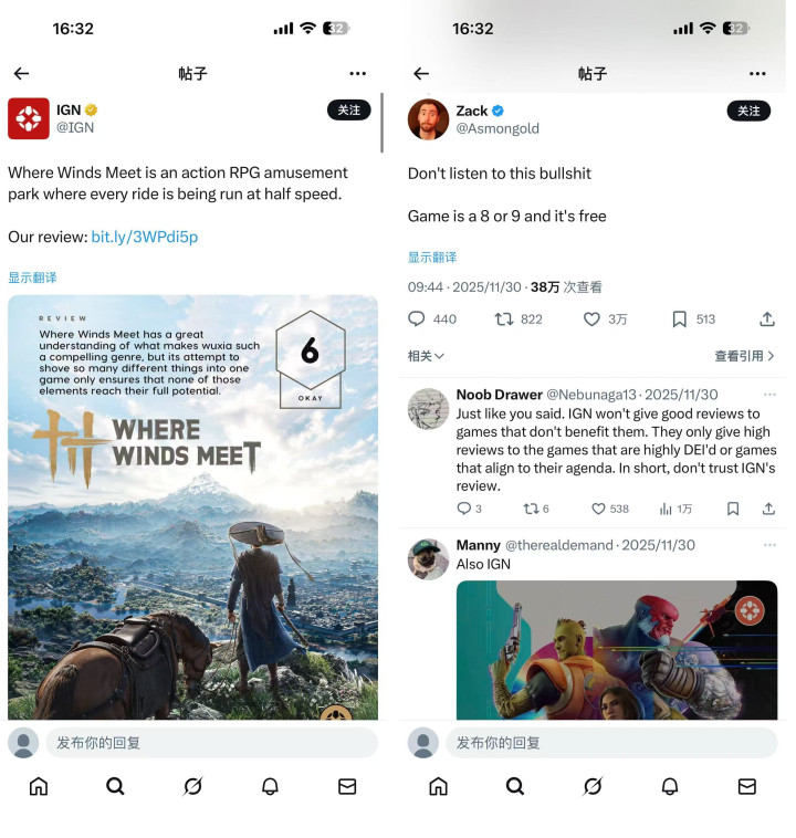 拥有700多万粉丝的知名游戏主播Asmongold直接冲到IGN的推特下留言开怼:“别听他们胡扯!这游戏至少值8到9分!”他的这番话迅速获得了社群的疯狂点赞,无数玩家在评论区声援:媒体的傲慢,早已与玩家的真实体验严重脱节。
